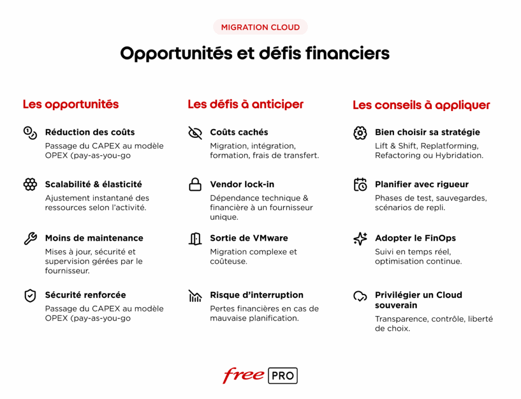 Free Pro propose un accompagnement complet, de l’audit initial jusqu’à l’optimisation post-migration, avec une vision claire, un pilotage rigoureux des coûts, et des solutions techniques sur mesure.