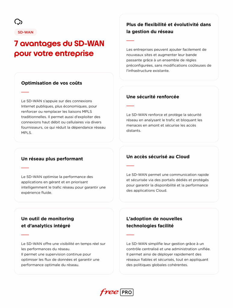 Le SD-WAN offre de nombreux bénéfices aux entreprises. Il permet d’optimiser les performances réseau en donnant la priorité aux applications critiques, comme la visioconférence ou les outils Cloud. Il contribue également à réduire les coûts en exploitant différentes connexions internet, plutôt que de dépendre exclusivement du MPLS. De plus, le SD-WAN améliore la sécurisation des données grâce à un chiffrement de ces dernières et une gestion centralisée des accès. Enfin, l’intégration d’un nouveau site est rapide et la gestion de son déploiement simplifiée, ce qui en fait une solution idéale pour les entreprises disposant de plusieurs sites.