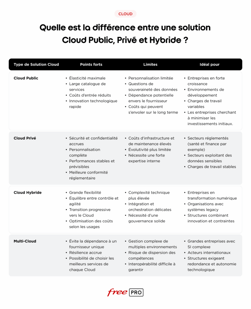 Pour dépasser les définitions théoriques et comprendre ce que chaque type de Cloud peut réellement apporter à votre entreprise, examinons leurs forces et limites respectives :