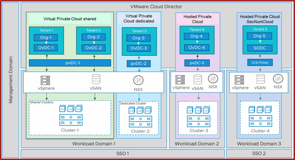 Notre proposition s’adosse, selon les modèles cloud souhaités, à des plateformes informatiques mutualisées ou dédiées, organisées en centres de données virtuel au sein d’une organisation.