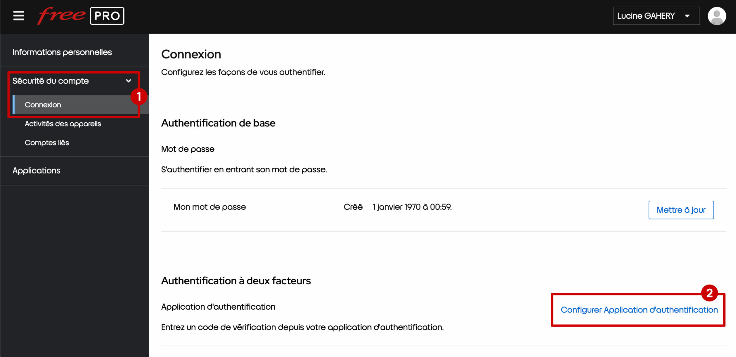 - En parallèle, connectez-vous via ce lien (lien à utiliser uniquement pour l’activation, la modification et la suppression de la double authentification) : https://sso.freepro.com/realms/Cust/account