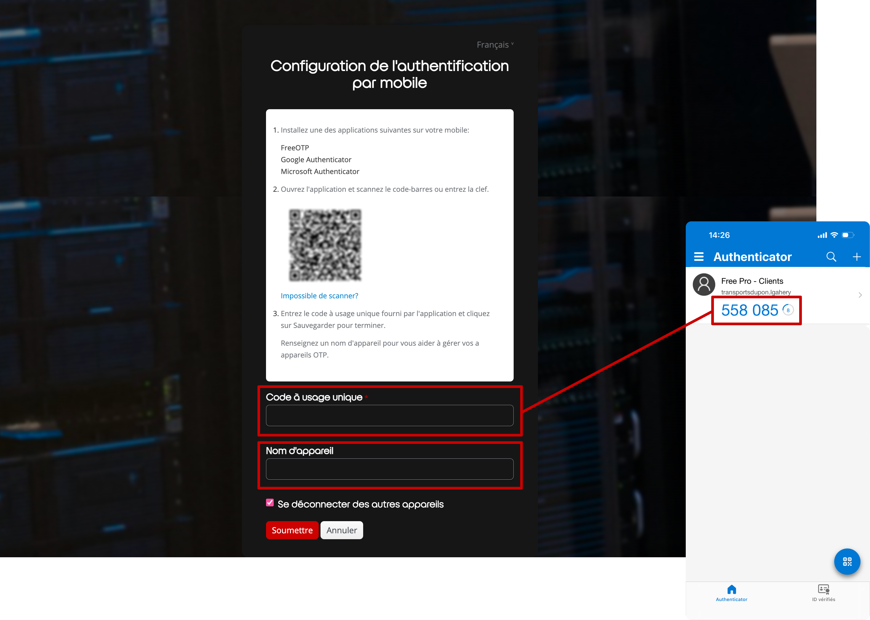 - Votre code à usage unique vous sera généré automatiquement. Il vous servira à vous connecter à votre Espace Client Free Pro et à d’autres applications Free Pro (comme Cloud XPR).